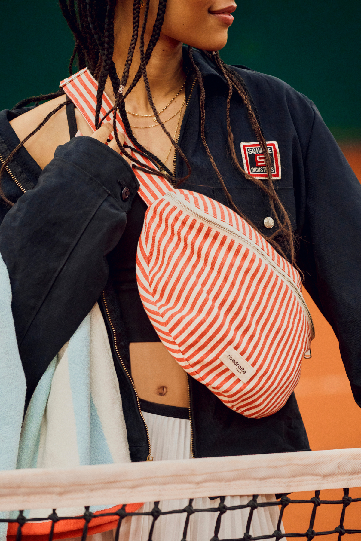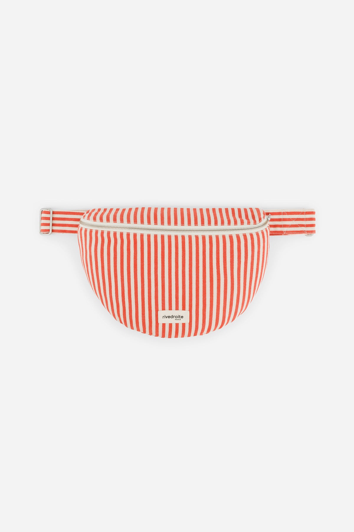 Regular price $100Custine comes in an XL version for busy days. You’ll love its rounded shape and large zipped interior pocket, perfect for keeping your everyday essentials organized. Its generous capacity can replace a handbag, allowing you to carry a scarf, wallet, charger, phone, glasses, medication, and more. The size is easily adjustable thanks to its adjustable strap. This season, it features recycled and organic cotton twill with stripes for a chic athletic look. It closes with a silver YKK zipper. The red lining, inspired by the stripe color, is made from upcycled textile scraps