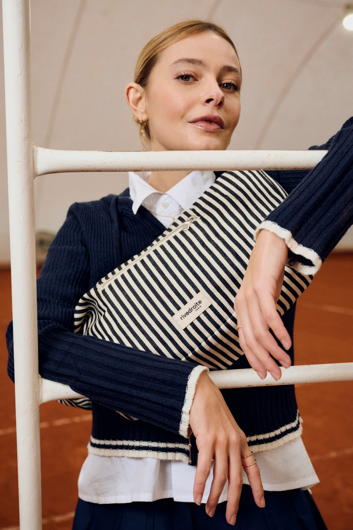 This version comes in recycled and organic cotton twill, adorned with colorful stripes for a chic athletic look. It closes with a silver YKK® zipper. The red lining, echoing the stripe colors, is made from upcycled polycotton.